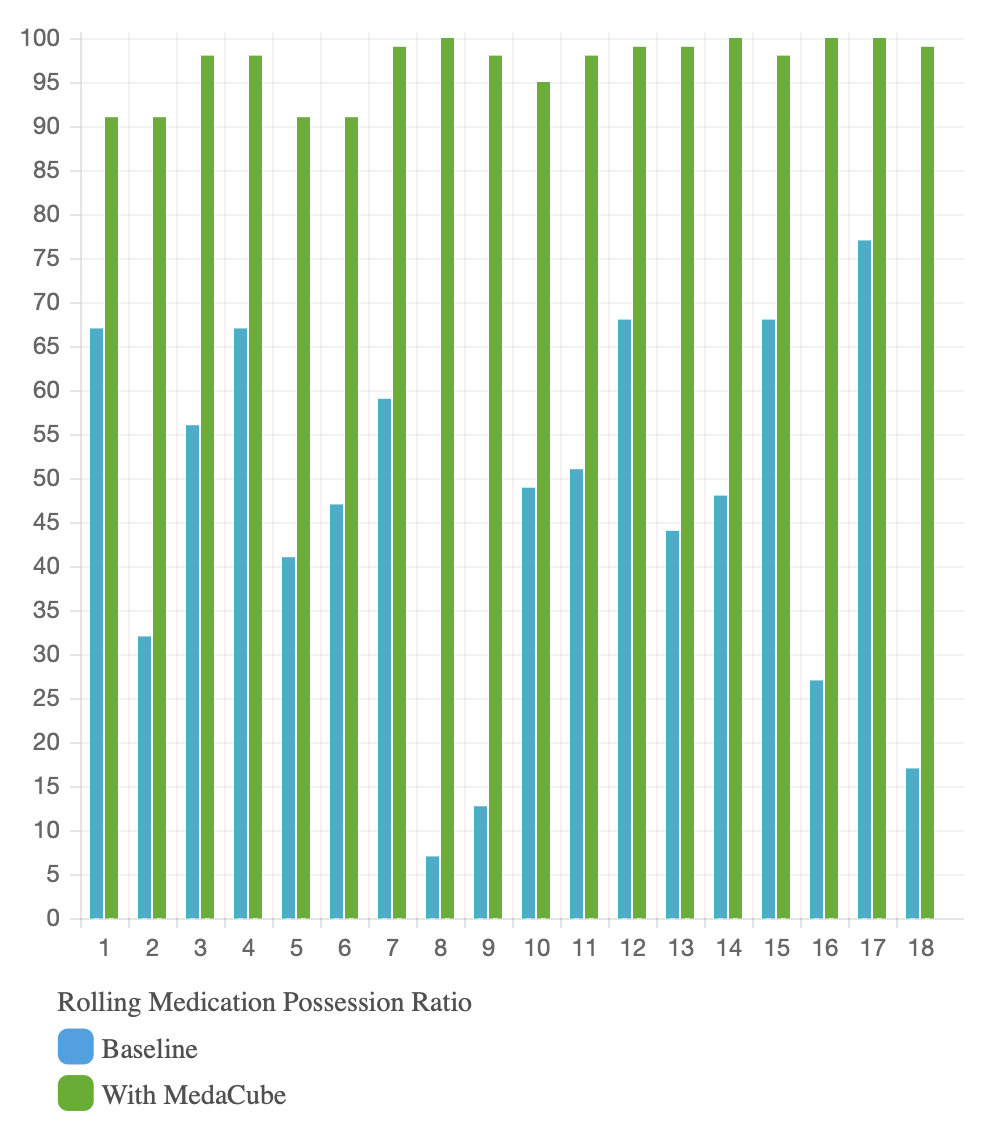 The following chart shows patients by number (1–18) and their adherence as a % of medications taken as prescribed. The blue “Baseline” is each patient’s adherence at the start of the study. The green columns show adherence results for each patient after 60 days with MedaCube. The patients are continuing to exhibit adherence of over 97% on average consistently after 18 months with MedaCube.